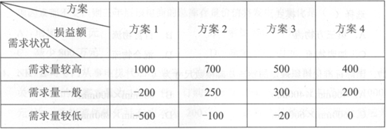 20、 某企業(yè)為擴大生產(chǎn),提出了四種方案,對未來市場需求大致估計為需求量較高、需求量一般和需求量較低三種情況,并估算出四種方案未來幾年在三種需求狀態(tài)下的損益額,如下表所示,若采用樂觀準則進行決策,則優(yōu)方案是( )。