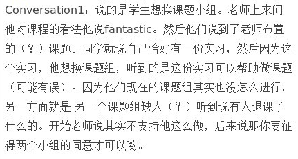 聽力第一個section,第一個conversation,學生要去辭去圖書館的工作,然后去某個另外的小組做項目,跟動物有關的,然后又和教授講起了鳥類行為的各種內(nèi)容,后詢問教授如何使得那個小組和圖書館方面都同意他的調(diào)換安排。