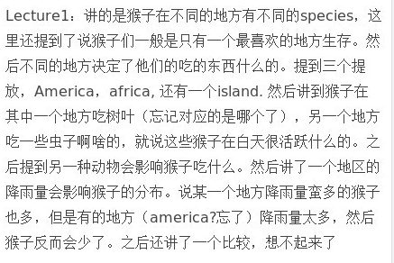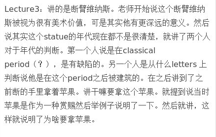 有一個lecture是說statue雕像,說的是Greek的,為什么會只有一部分的殘余雕像,貌似雕像缺了個arm和shoulder ,一開始的一個科學家不太抓住考古的關鍵點,用的是incorrect assumptions .and analysis ,沒對雕像的歷史做出合理解釋,第二個科學家卻做出了很好的解釋,例如他找出了這個雕像缺的那部分其實是原本手里拿著個金蘋果,歷史的由來是在學校里上課,老師對那些對于老師做出的問題給出正確選擇的學生會獎勵他一個的金蘋果。