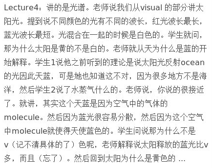 有一個lecture是說太陽光的可見光的波長的不同,因為會經(jīng)過地球大氣層造成偏射,人眼對藍光和黃光的敏感度不同 所以看天空經(jīng)常是藍色的。