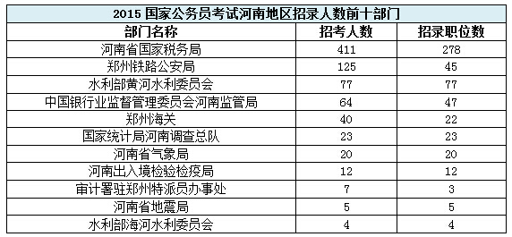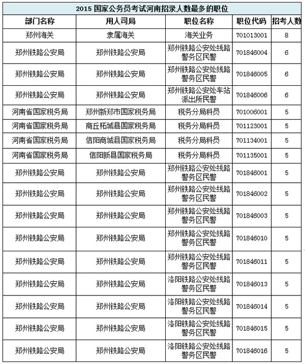 其中省(副省)級職位招錄22人,地市級職位招錄115人,縣(區(qū))級以下職位招錄653人。河南省國家稅務(wù)局招錄411人,領(lǐng)銜眾招錄部門之首,鄭州鐵路公安局、中國銀行業(yè)監(jiān)督管理委員會河南監(jiān)管局等緊跟其后。其中,鄭州海關(guān)的海關(guān)業(yè)務(wù)(職位代碼:701013001)一職招錄8人,為本次河南招錄大戶。