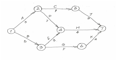 某施工單位承擔(dān)一礦井采區(qū)巷道的施工任務(wù),建設(shè)單位要求的工期為15個(gè)月,施工單位根據(jù)該礦井采區(qū)巷道的關(guān)系,編制了采區(qū)巷道施工網(wǎng)絡(luò)進(jìn)度計(jì)劃(如圖1所示),安排了4個(gè)施工隊(duì)伍進(jìn)行施工,各施工隊(duì)伍的施工內(nèi)容分別為:甲隊(duì)A、C、J,乙隊(duì):B、G、K,丙隊(duì)D、H,丁隊(duì):E。