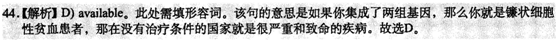 他說, “這是一種遺傳混亂現(xiàn)象。如果你從父母身上(41) 繼承了一組基因,你不會有任何的癥狀,只被稱為(42) 攜帶者異形接合體人。如果你集成了兩組基因,那么你就是鐮狀細胞性貧血患者,那在沒有治療(44) 條件的國家 就是很(43) 嚴重和致命的疾病?!?BR> 開始,這種病只是在瘧疾盛行的地方,但因為人口(45) 流動,現(xiàn)在也在世界其它地方普遍起來。所以,這種疾病顯而易見已經(jīng)是世界的負擔并且有增長的趨勢。