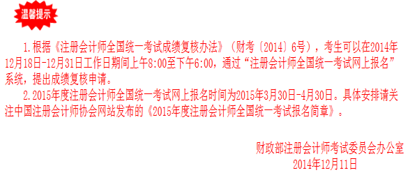 2015年度注冊會計師全國統(tǒng)一考試網(wǎng)上報名時間為2015年3月30日-4月30日。具體安排請關(guān)注中國注冊會計師協(xié)會網(wǎng)站發(fā)布的《2015年度注冊會計師全國統(tǒng)一考試報名簡章》。