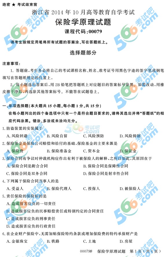 2014年10月自學(xué)考試試題《保險學(xué)原理》