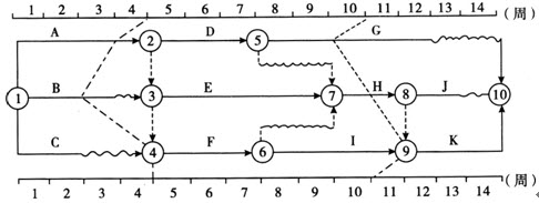 17.某工程雙代號時(shí)標(biāo)網(wǎng)絡(luò)計(jì)劃執(zhí)行到第4周末和第10周末時(shí),檢查其實(shí)際進(jìn)度如圖前鋒線所示,檢查結(jié)果表明( ?。?BR>