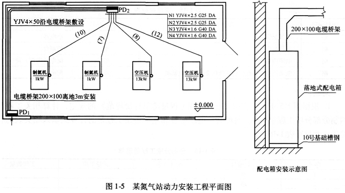 1)PD1、PD2均為定型動力配電箱,落地式安裝,基礎(chǔ)型鋼用10號槽鋼制作,其質(zhì)量按10kg/m計(jì)。