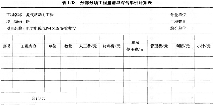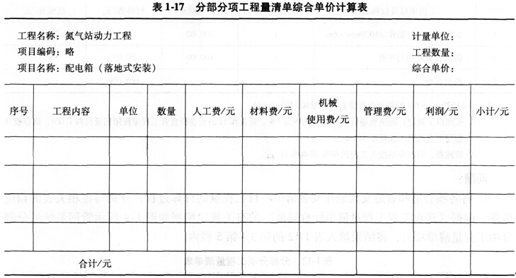 2.假設(shè)電力電纜YJV4 × 16穿管敷設(shè)的清單工程量為30m,依據(jù)上述相關(guān)費(fèi)用數(shù)據(jù)計(jì)算配電箱(落地式安裝)和電力電纜YJV4×16穿管敷設(shè)兩個(gè)項(xiàng)目的綜合單價(jià),并分別填人表1-17和表1-18(計(jì)算過程和結(jié)果均保留兩位小數(shù))。