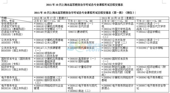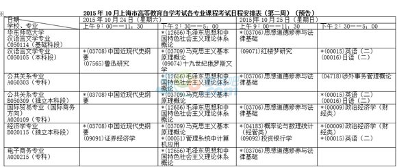 2015年10月上海市高等教育自學(xué)考試各專業(yè)課程考試日程安排表