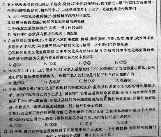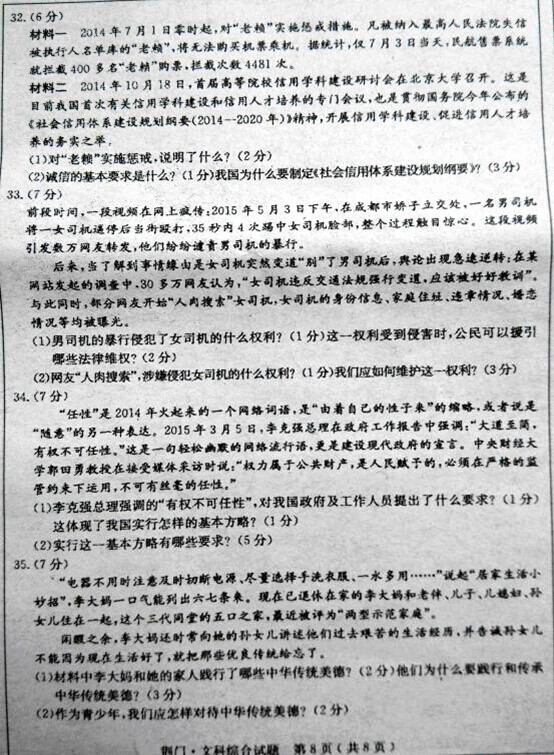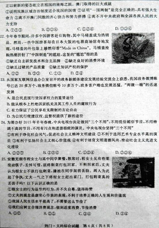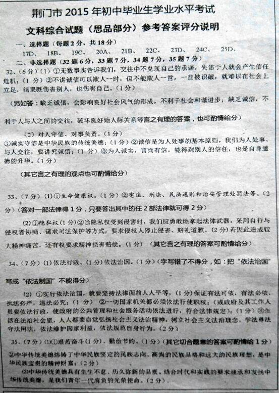 2015年湖北荊門中考政治真題及答案(完整版)