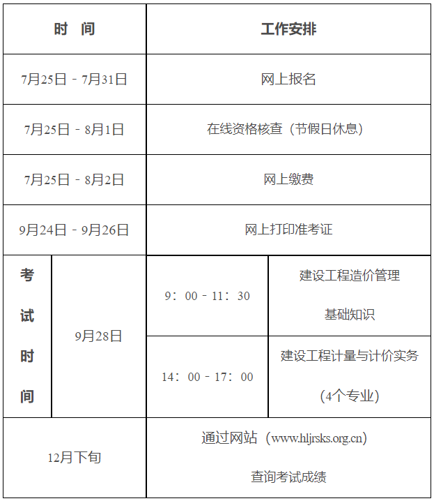 根據(jù)黑龍江省人事考試網(wǎng)發(fā)布的《2024年黑龍江二級造價工程師職業(yè)資格考試工作通知》獲悉,2024年黑龍江二級造價工程師考試時間定于2024年9月28日舉行,具體時間、科目安排如下:
