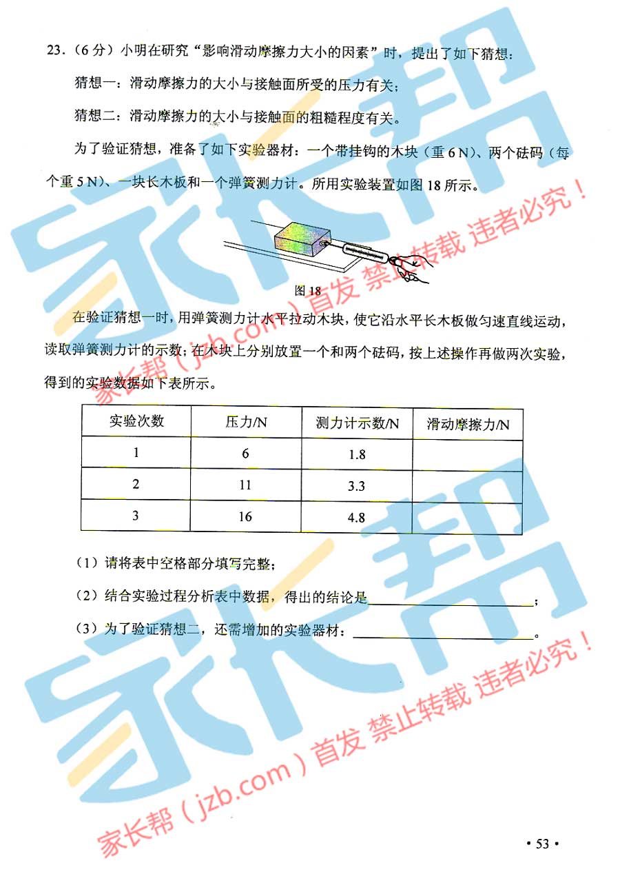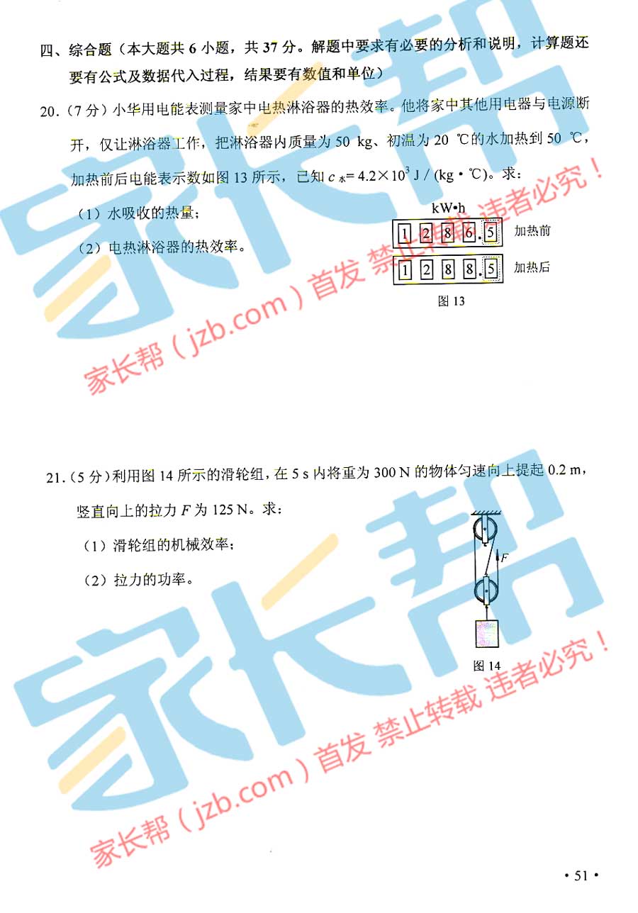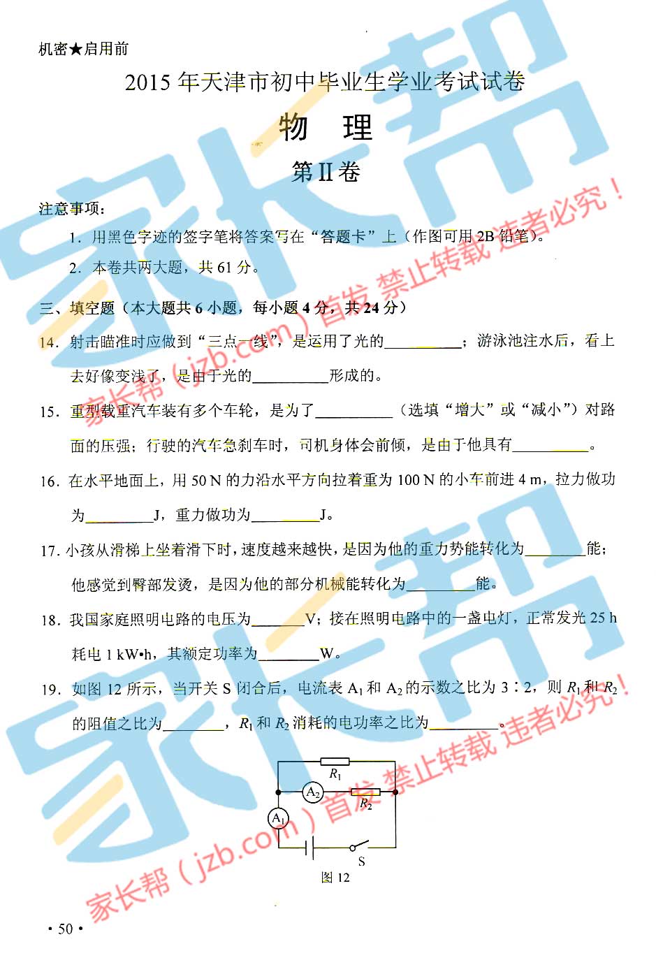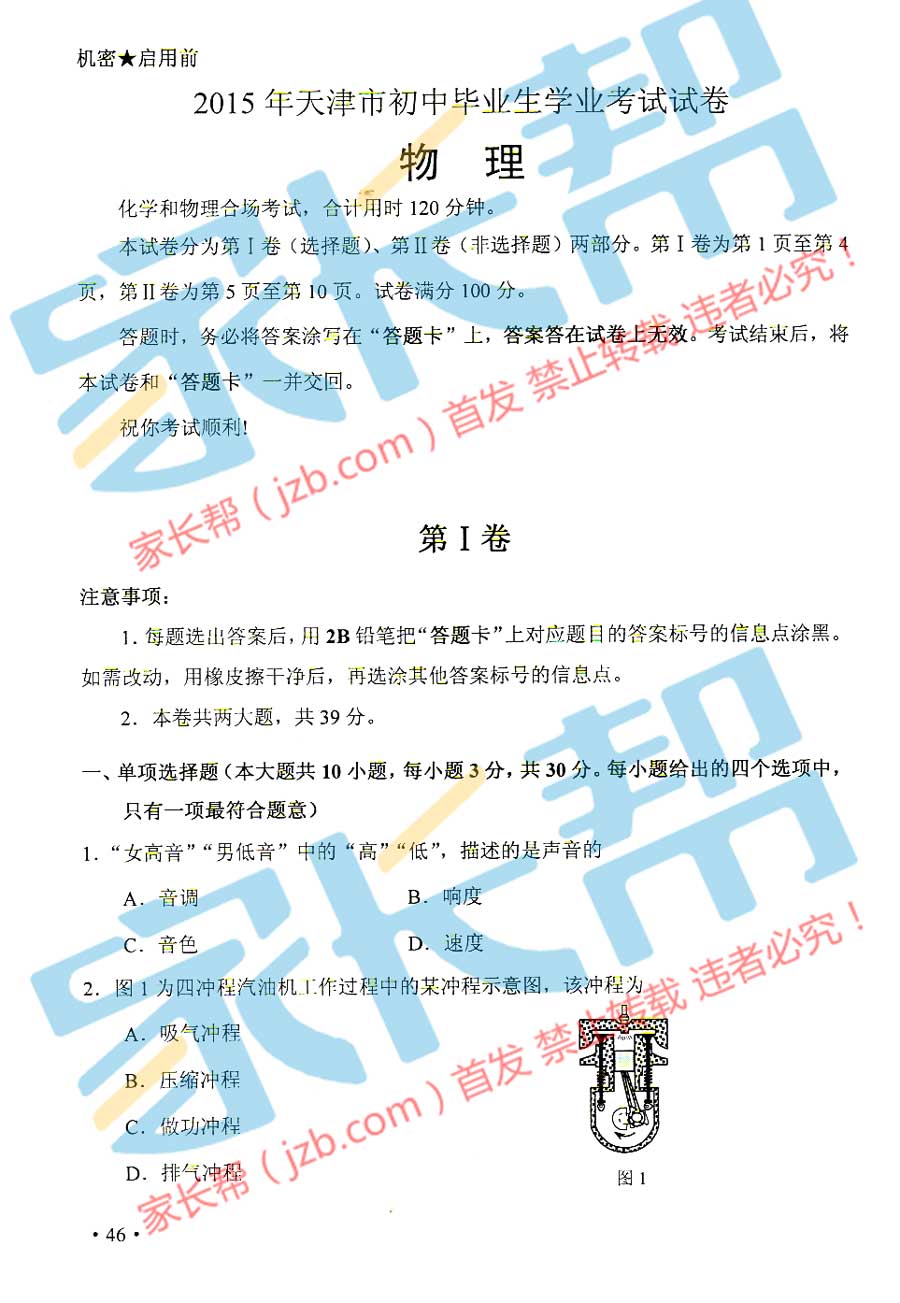 2015年天津塘沽中考物理試題(已公布)