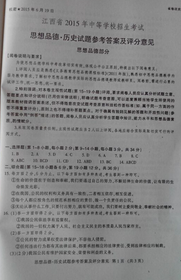 2015年江西鷹潭中考政治答案(已公布)