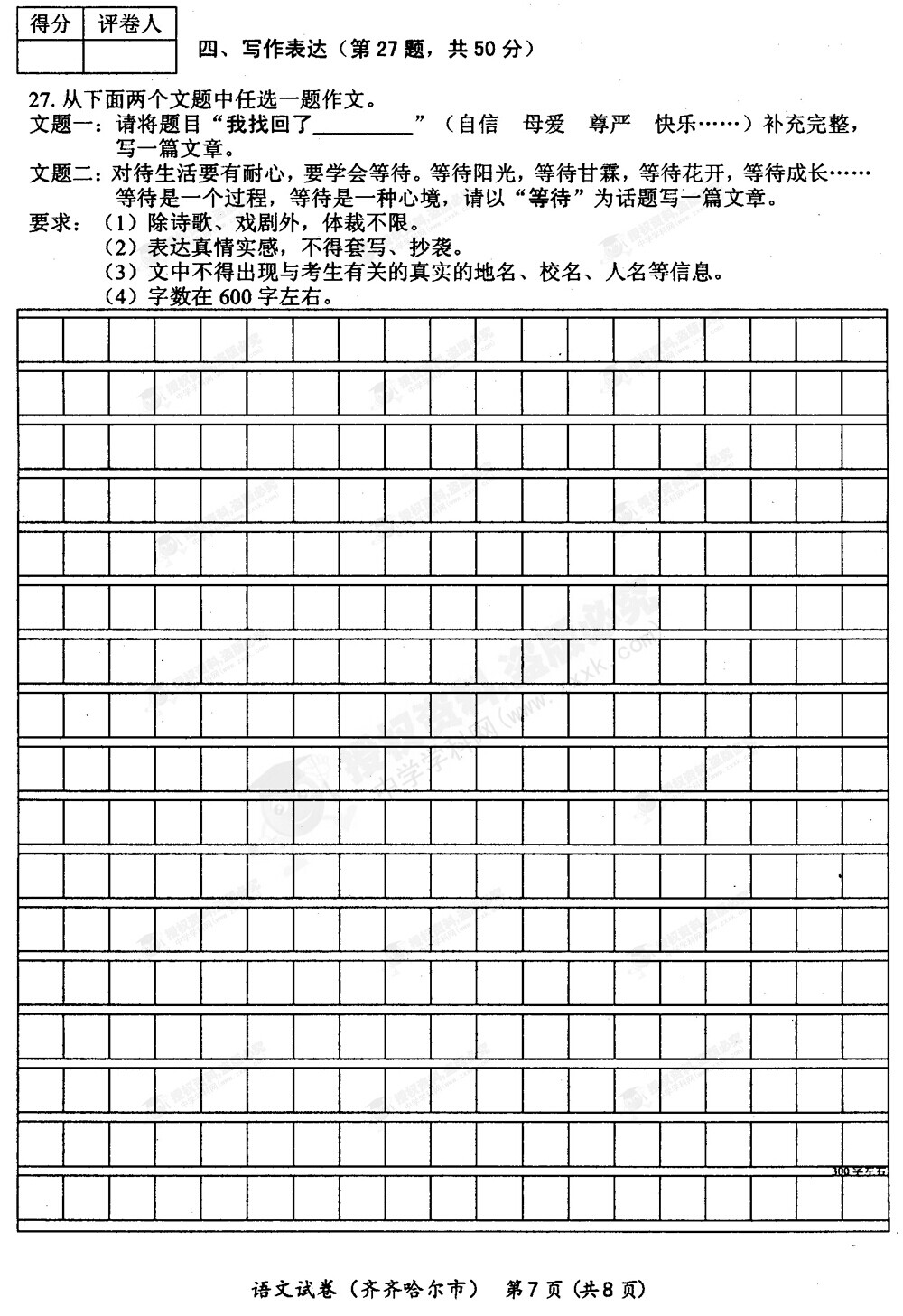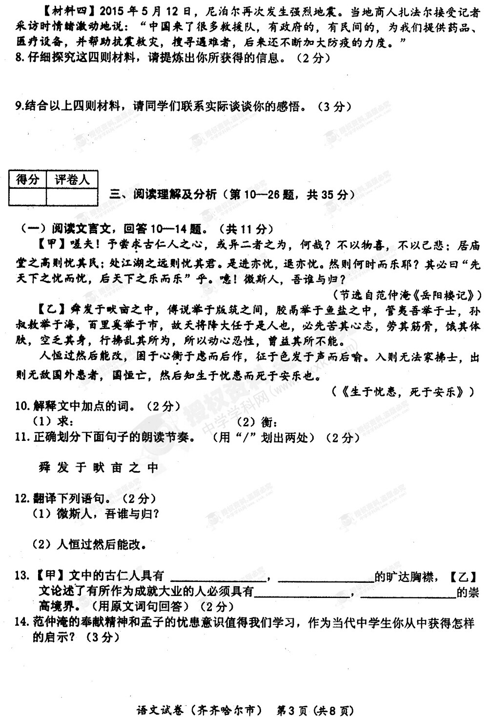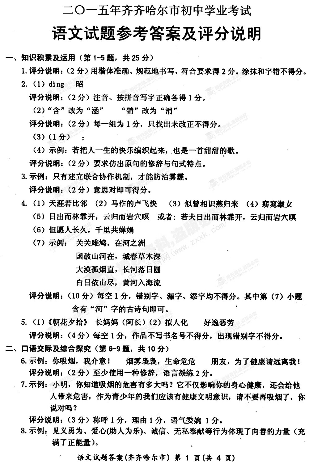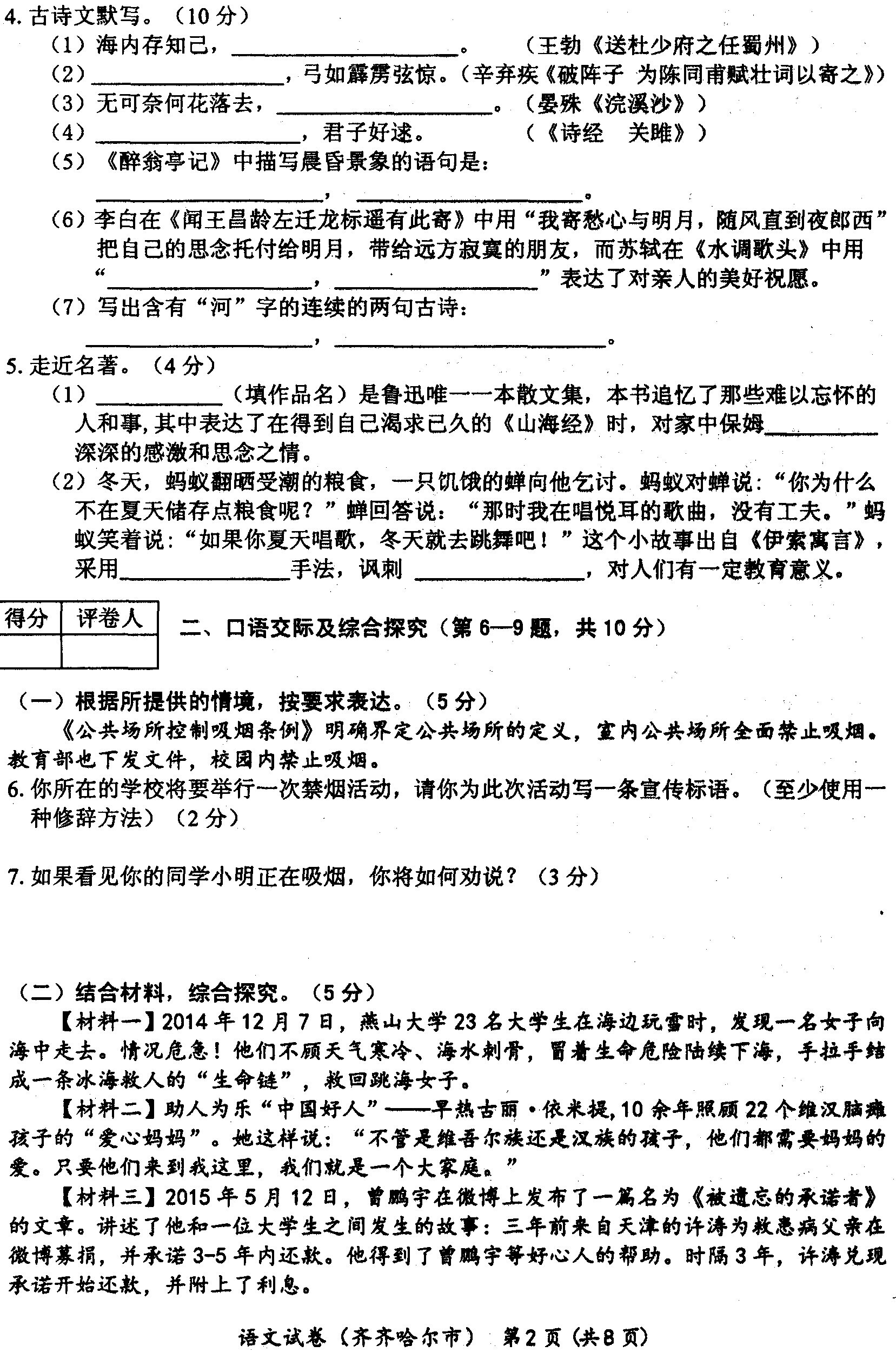 2015年黑龍江黑河中考語文試題及答案(已公布)