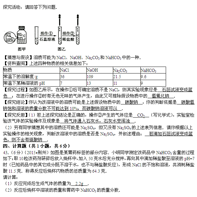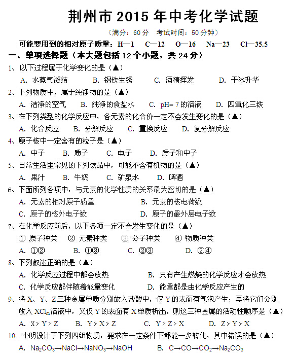 2015年湖北荊州中考化學(xué)試卷及答案(完整版)