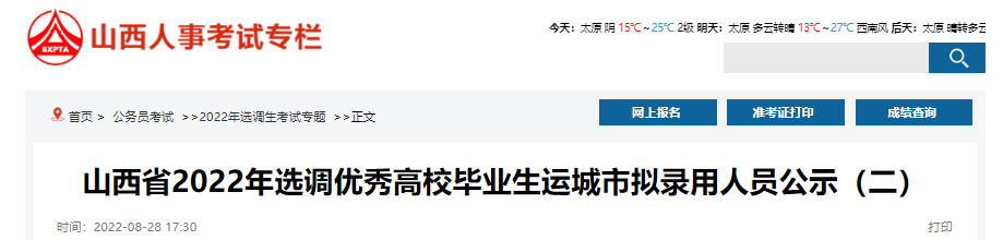 2022年山西運(yùn)城市面向優(yōu)秀高校畢業(yè)生招錄選調(diào)生擬錄用人員公示(二)已公布,為了方便廣大考生的查閱,下面為您詳細(xì)介紹一下本次擬錄用人員公示的具體事宜,希望廣大考生及時關(guān)注,如有相關(guān)疑問,請關(guān)注為您實時做出的更新。