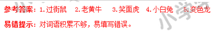 詳解:題1中的內(nèi)容很自然讓人想到“老鼠過街、人人喊打”,所以正確答案是“過街鼠”;題2中的任勞任怨,是人們經(jīng)常形容老黃牛的詞語,所以正確答案是“老黃牛”;題3中外表和內(nèi)心反差的形象,很容易讓人想到了“笑面虎”;題4中溫柔善良、非??蓯鄣男蜗?,在十二生肖中只有兔子符合,所以正確答案是“小白兔”;題4中,人們常常用變色龍來形容一個(gè)人善于偽裝和變化,所以正確答案是“變色龍”。