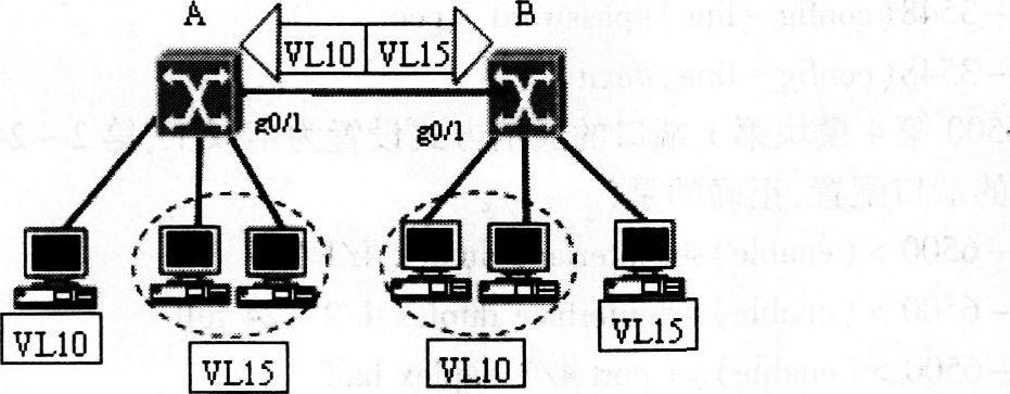 3、如下圖所示,Ciseo 3548交換機(jī)A與B之間需傳輸名為VL10(ID號為10)和VL15(ID號為15)的VLAN信息。下列為交換機(jī)A的g0/1端口分配VLAN的配置,正確的是( ?。?。