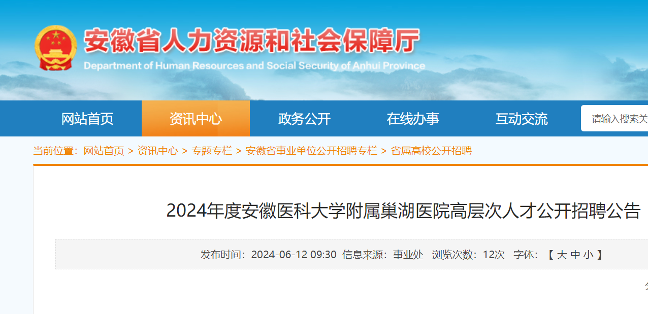 為做好2024年度安徽醫(yī)科大學附屬巢湖醫(yī)院面向社會公開招聘高層次人才工作,根據(jù)《事業(yè)單位人事管理條例》(國務院令第652號)和中共安徽省委組織部、安徽省人力資源和社會保障廳《關于印發(fā)<安徽省事業(yè)單位公開招聘人員暫行辦法〉的通知》(皖人社發(fā)〔2010〕78號)規(guī)定,現(xiàn)就有關事項公告如下: