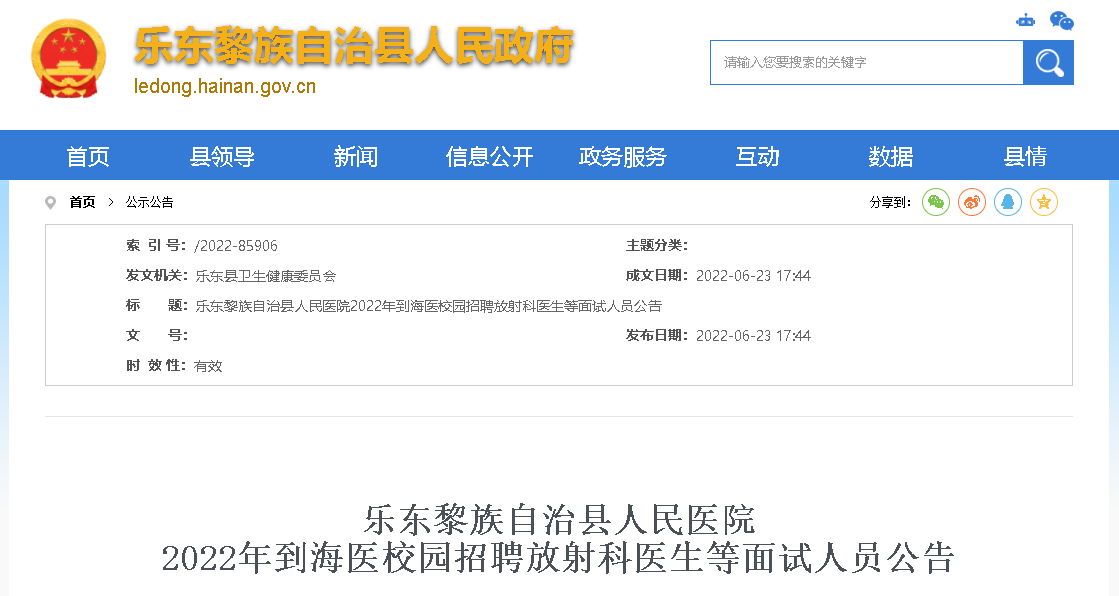2022海南樂東黎族自治縣人民醫(yī)院到海醫(yī)校園招聘放射科醫(yī)生等面試人員公告已出,公示期限:2022年6月23日至2022年6月29日,現(xiàn)將招聘公告原文發(fā)布如下: