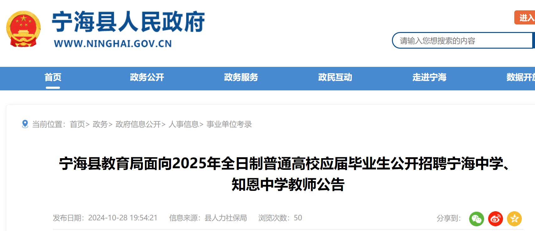 2025年浙江寧波寧??h面向全日制普通高校應(yīng)屆畢業(yè)生招聘寧海中學(xué)、知恩中學(xué)教師公告已發(fā)布,網(wǎng)上報名時間:2024年10月29日9:00至11月3日16:00。現(xiàn)將招聘公告原文發(fā)布如下: