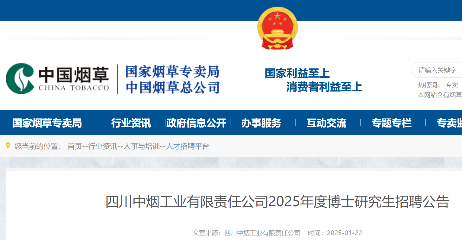 2025年度四川中煙工業(yè)有限責(zé)任公司博士研究生招聘公告已發(fā)布,報(bào)名時(shí)間:2025年2月6日9:00至2025年2月12日17:00?,F(xiàn)將招聘公告原文發(fā)布如下: