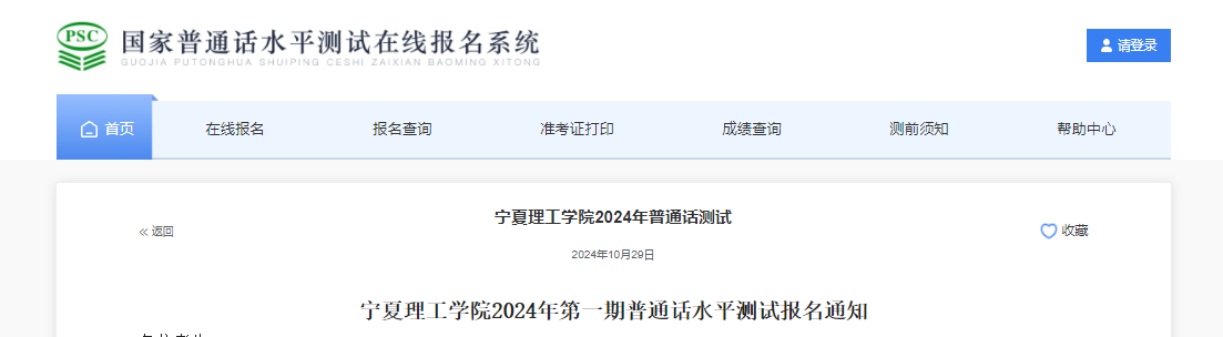 從國家普通話水平測試在線報名系統(tǒng)獲悉,寧夏理工學院2024年第一期普通話水平測試報名通知已公布,10月30日起報名,具體詳情如下: