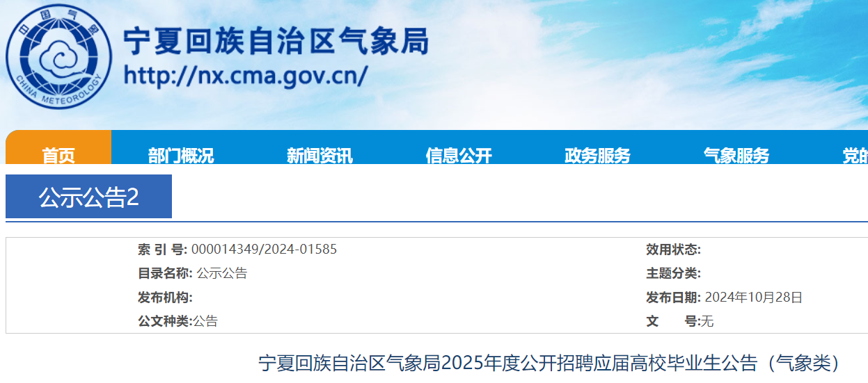 根據(jù)《氣象部門事業(yè)單位公開招聘人員管理辦法》等有關(guān)規(guī)定和工作需要,寧夏回族自治區(qū)氣象局決定公開招聘2025年度氣象類專業(yè)應(yīng)屆高校畢業(yè)生。現(xiàn)將有關(guān)事項公告如下: