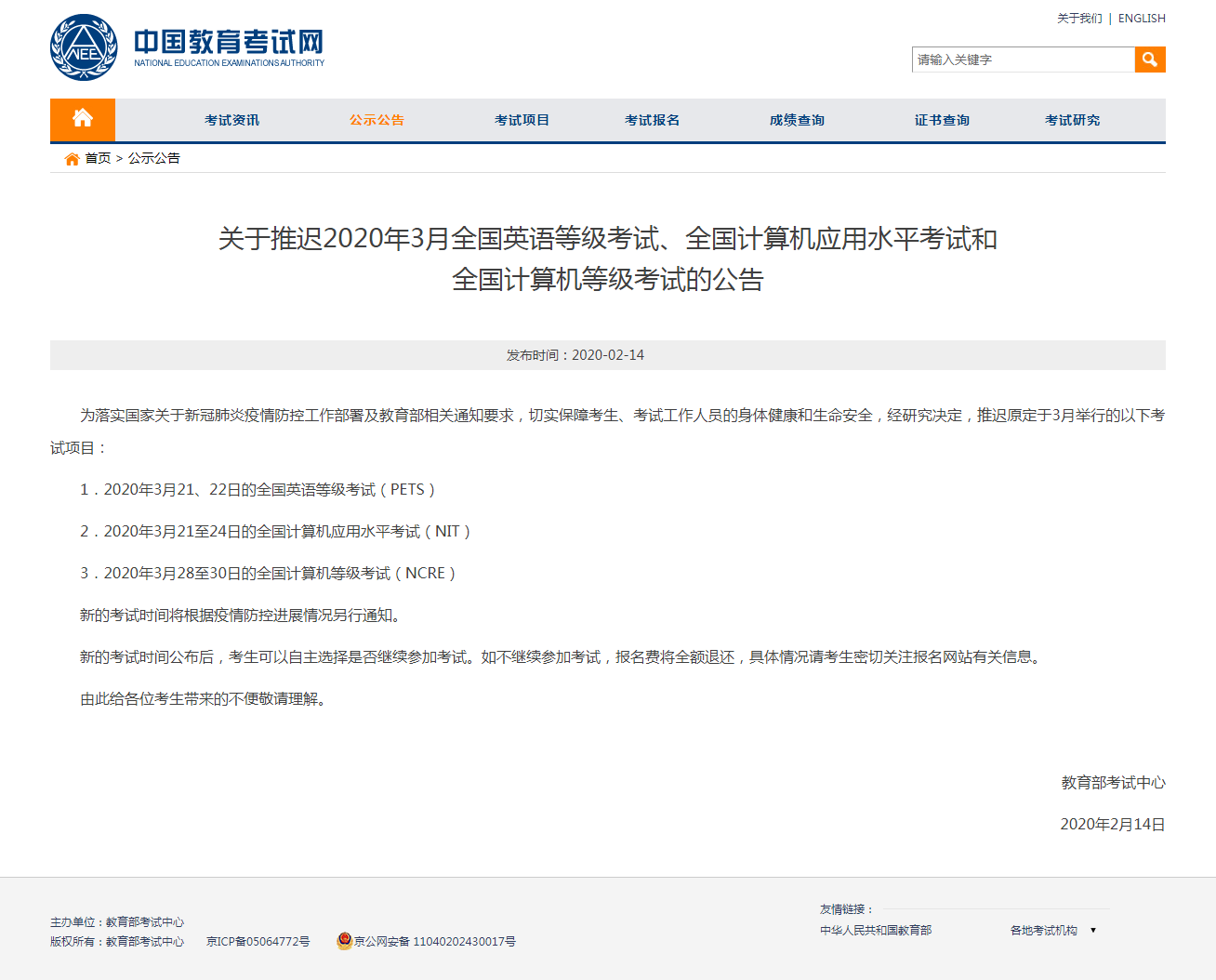 為落實(shí)國(guó)家關(guān)于新冠肺炎疫情防控工作部署及教育部相關(guān)通知要求,切實(shí)保障考生、考試工作人員的身體健康和生命安全,經(jīng)研究決定,推遲原定于3月舉行的以下考試項(xiàng)目: