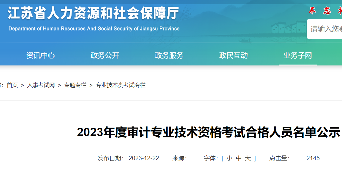 小編根據(jù)江蘇省人力資源和社會保障廳發(fā)布“2023年度審計專業(yè)技術(shù)資格考試合格人員名單公示”得知,江蘇2023年審計師考試合格人員名單公示,公示期至2023年12月31日截止,合格人員可于網(wǎng)上公示期結(jié)束后,登錄中國人事考試網(wǎng)進(jìn)行下載和查詢驗(yàn)證專業(yè)技術(shù)人員職業(yè)資格電子證書。