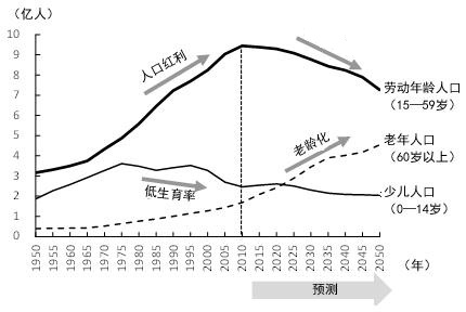 (1)①趨勢(shì):2010年后,勞動(dòng)年齡人口呈下降趨勢(shì),人口紅利逐漸消失,人口負(fù)擔(dān)加劇。隨著低生育率的長(zhǎng)期化,人口老齡化加劇。(2分)