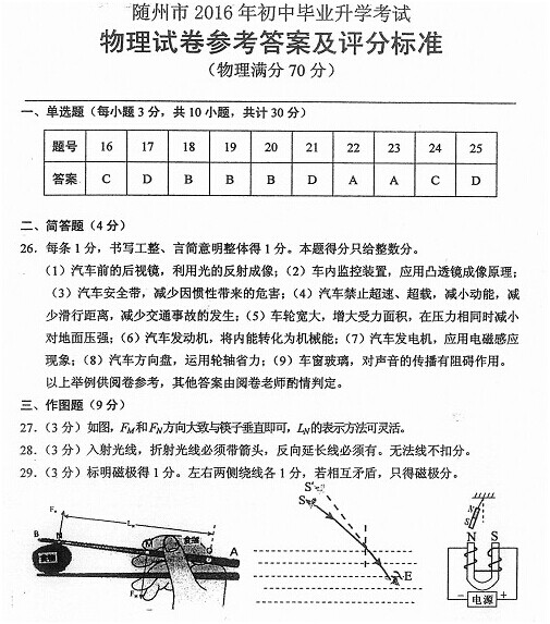 2016年湖北隨州中考物理試卷及答案(已公布)