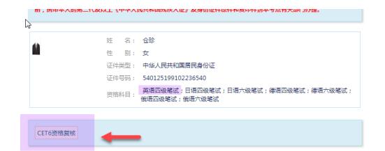 11、若考生有通過CET4的證書(425分以上)、筆試報(bào)區(qū)開考CET6、考生未被限制報(bào)考CET6、資格科目顯示卻無英語六級(jí)報(bào)考資格,此時(shí)《資格信息確認(rèn)》頁面會(huì)顯示“CET6資格復(fù)核”按鈕: