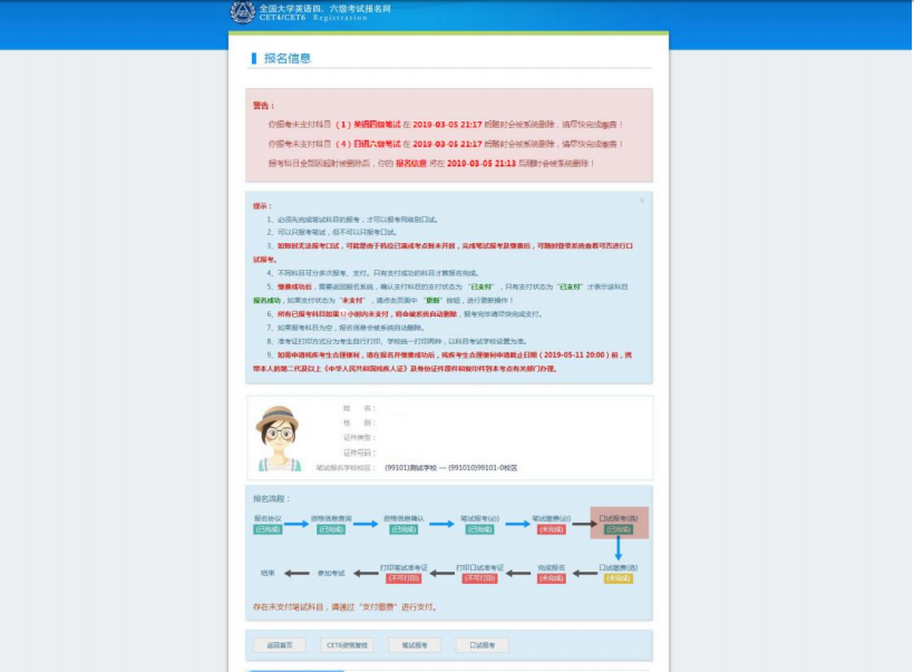可看到報(bào)名流程的進(jìn)度:已完成筆試報(bào)考,可直接在下方進(jìn)行繳費(fèi)。也可在頁面中間部分繼續(xù)選擇“口試報(bào)考”;或“CET6資格復(fù)核”: