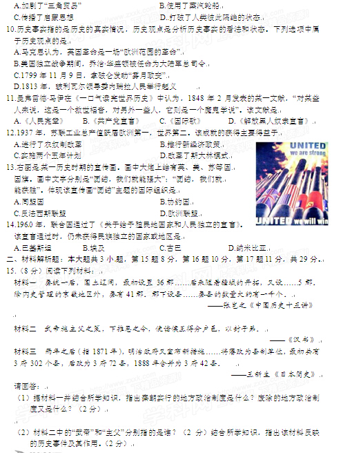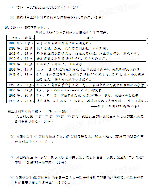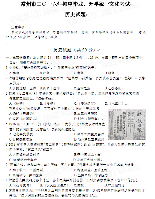 2016年江蘇常州中考?xì)v史試題(已公布)