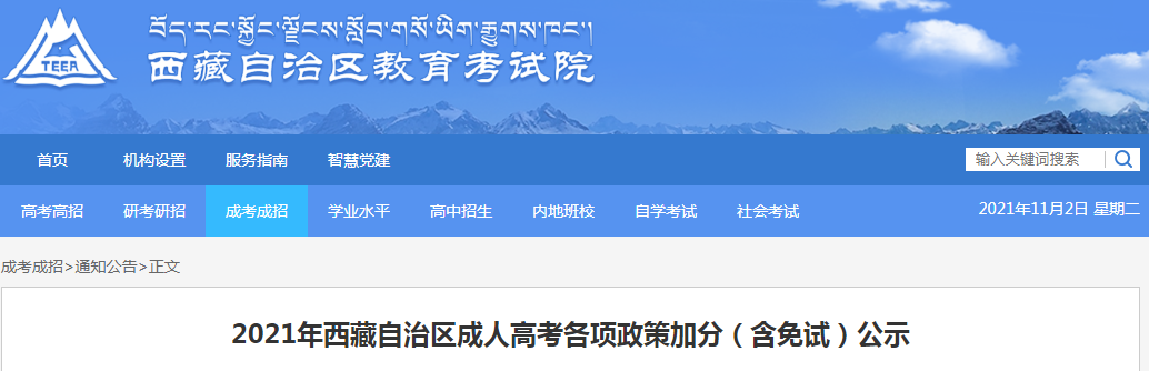 從西藏教育考試院了解到,2021年西藏自治區(qū)成人高考各項(xiàng)政策加分(含免試)公示,具體如下: