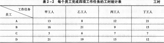某車間產品裝配組有甲、乙、丙、丁四位員工,現有A、B、C、D四項任務,在現有生產技術及組織條件下,每位員工完成每項工作所需要的工時如表1所示。請運用匈牙利法求出員工與任務的分配方案,以保證完成任務的總時間最短,并求出完成任務需要的總工時。