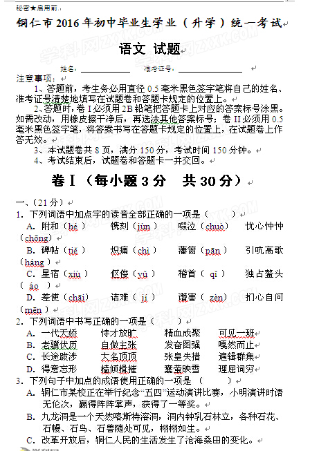 2016年貴州銅仁中考語(yǔ)文試題(已公布)
