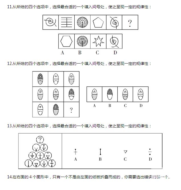 12.【答案】C。解析:每行或每列的構(gòu)成元素完全相同,只是出現(xiàn)的位置不同,故應(yīng)選擇上部帶“三角形”,下部帶“曲線”和“小黑點(diǎn)”的圖形,答案為C。