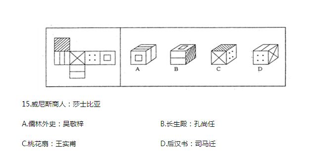 15.【答案】A。解析:題干所述關(guān)系為作品和作者,A項(xiàng)與之相符?!堕L(zhǎng)生殿》的作者是洪昇;孔尚任作《桃花扇》;王實(shí)甫作《西廂記》;《后漢書》為范曄所作;司馬遷作《史記》。
