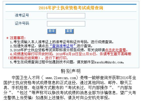 特別提醒:2016年護士資格考試成績通知單打印開放時間為2016年8月18日至11月30日,務(wù)請考生避開高峰期(初期和臨近結(jié)束期),進行下載打印。護士考試成績通知單作為領(lǐng)取《護士執(zhí)業(yè)資格考試成績合格證明》有效憑證,務(wù)請考生在2016年8月18日至11月30日下載打印并妥善保管?!蹲o士執(zhí)業(yè)資格考試成績合格證明》是申請護士執(zhí)業(yè)注冊的有效證明,合格考生需密切關(guān)注當(dāng)?shù)乜键c考試管理機構(gòu)的通知,及時領(lǐng)取成績合格證明,并妥善保管。
