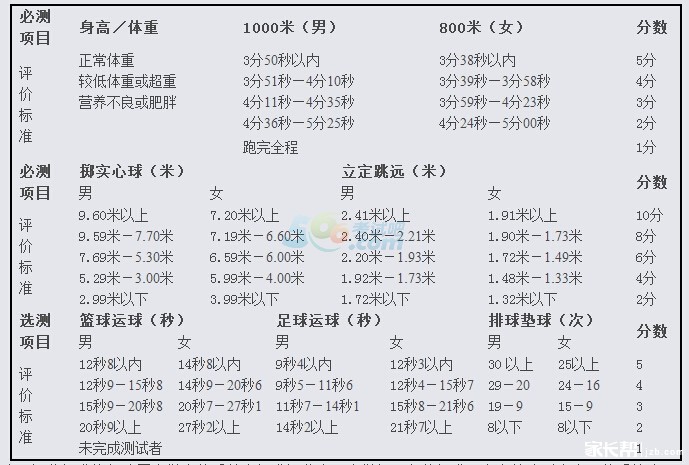 注:評(píng)分標(biāo)準(zhǔn)執(zhí)行《國(guó)家學(xué)生體質(zhì)健康標(biāo)準(zhǔn)評(píng)分表(中學(xué)組)》的標(biāo)準(zhǔn)。身高精確到毫米,體重精確到0.1公斤,1000和800米精確到秒,擲實(shí)心球和立定跳遠(yuǎn)精確到厘米,籃球、足球運(yùn)球精確到0.1秒,排球墊球精確到整數(shù)。