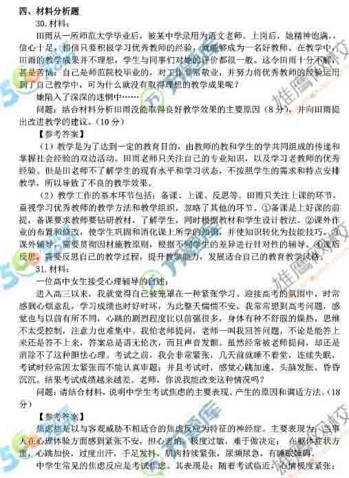 【考生能夠從教學(xué)規(guī)律和原則、學(xué)習(xí)動(dòng)機(jī)、師生關(guān)系等角度分析材料,強(qiáng)調(diào)教學(xué)過(guò)程學(xué)生的參與,教師與學(xué)生的互動(dòng),學(xué)生的身心特點(diǎn)對(duì)教學(xué)結(jié)果的影響等等,能夠自圓其說(shuō),即可酌情給分?!?BR> 31、材料: