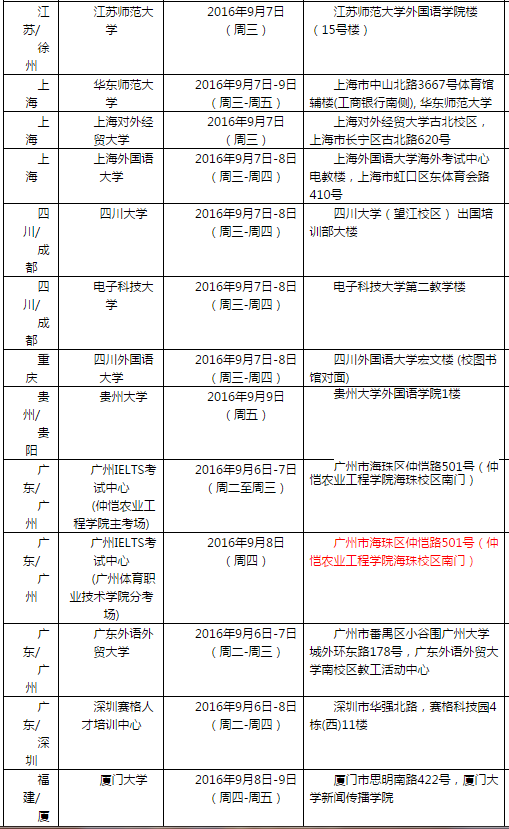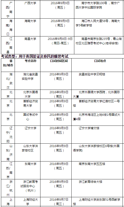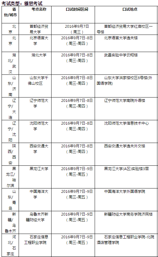 接英國文化教育協(xié)會通知,報考2016年9月10日雅思考試的考生口語安排如下, 供廣大考生參考。請在筆試日期前十天登錄雅思考試報名網(wǎng)站查詢您的口試安排,打印準(zhǔn)考證并以準(zhǔn)考證信息為準(zhǔn)。