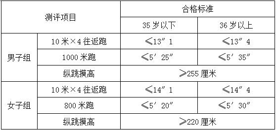 (五)體能測評??忌ㄟ^資格審查后,參照《人民警察體能測評標準》進行體能測評。體能測評時間為2016年10月28日上午8:30—11:00。未參加體能測評或測評不合格的,取消其考試資格。體能測評合格標準如下: