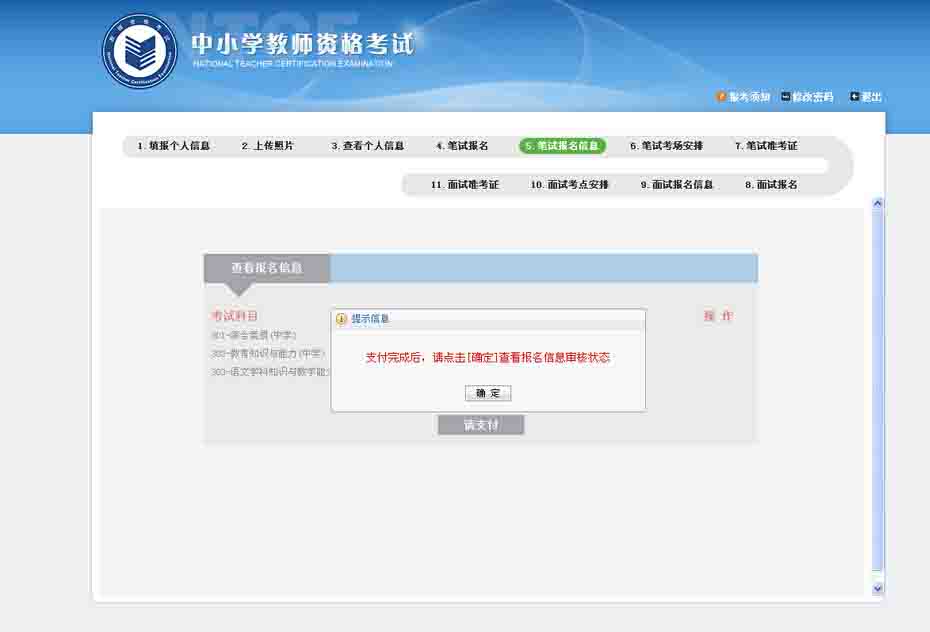 (5)支付成功后,考生回到網(wǎng)上報(bào)名系統(tǒng)[報(bào)名信息]頁面(參見圖2),點(diǎn)擊“確定”按鈕,頁面刷新,顯示最新的支付結(jié)果及報(bào)名信息。(圖5)