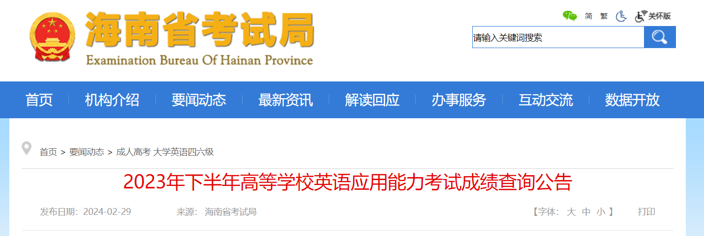 從海南省考試局獲悉,2023下半年海南高等學校英語應用能力考試成績查詢公告已公布,即日起查分,具體詳情如下:
