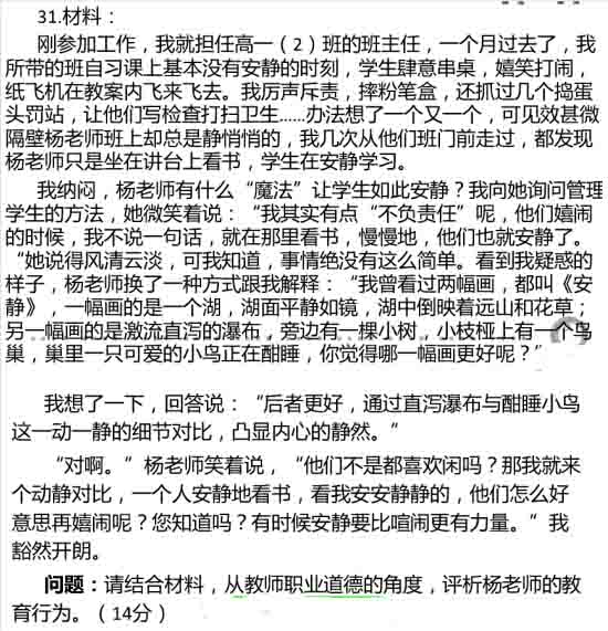 問(wèn)題:請(qǐng)結(jié)合材料,從教育觀的角度,評(píng)析李老師的教育行為。(14分)
