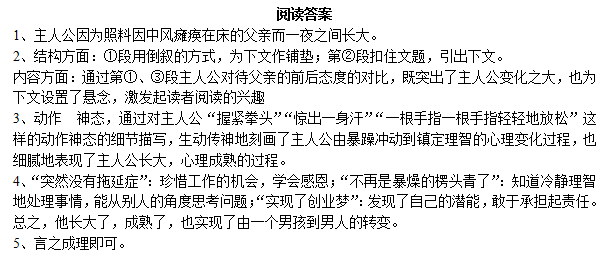 ②來(lái)探病的朋友吃了一驚:“你像一夜之間長(zhǎng)大了?!?BR> ③他也沒(méi)想過(guò)會(huì)這樣。他在家里賴到二十八九,日子過(guò)得生機(jī)勃勃:也戀愛(ài)也上班也交友,動(dòng)不動(dòng)和父母吵架—不吵不行呀。父親節(jié)儉,保鮮袋用過(guò)再用,一揭開(kāi),西瓜上全是魚腥氣;又天真,看到電視上“只要888元”的廣告,就打算打電話,被他一頓臭罵,訕訕地又咳嗽又揉鼻子;這么老大,父親仍然會(huì)沒(méi)事翻他的抽屜雜物,他沒(méi)好氣吼過(guò)去:“翻什么翻!”