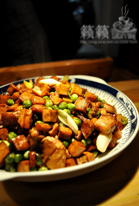原料:香干;青豆;水煮五花肉;姜片;青蒜1根;鹽;糖;生抽;老抽;